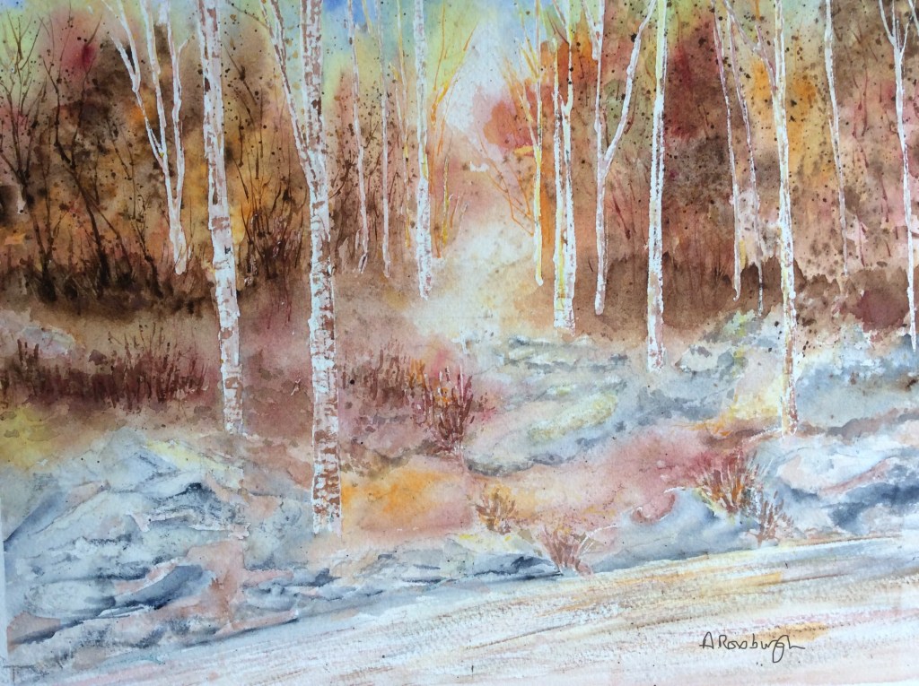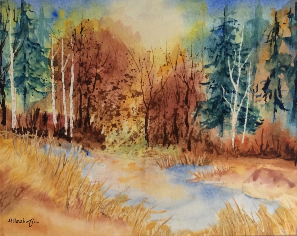Anne’s watercolours depict our Canadian seasons and each captures the summer greens, autumn’s riot of colours, the winter’s sculptural snowscapes and the stark bareness of naked trees. When Anne studied at the Banff School of Fine Arts her teacher told the class not to paint the Rockies, but instead was instructed to find your own special piece of landscape and this is when Anne formed her love of the rugged nature of rocks, rivers and trees.
