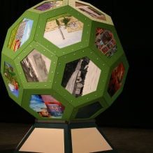A buckyball is like a soccer ball; 32 panels that form a sphere. 32 artists chose a mill to represent in their own medium and style on a panel of the buckyball. Our buckyball measures 5 ft in diameter when assembled.