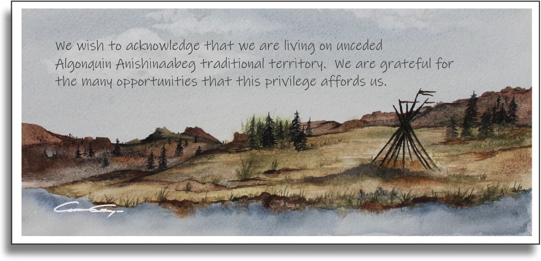 The pandemic prevented us from gathering as a group to create art projects for our town. However, we wished to continue our tradition of giving back at each AITA show so we purchased a Land Acknowledgement Statement Plaque that was created by Colleen Gray, an Indigenous artist and member of our association. This plaque is to be installed in the Ron Caron Auditorium in Almonte Old Town Hall where AITA takes place.