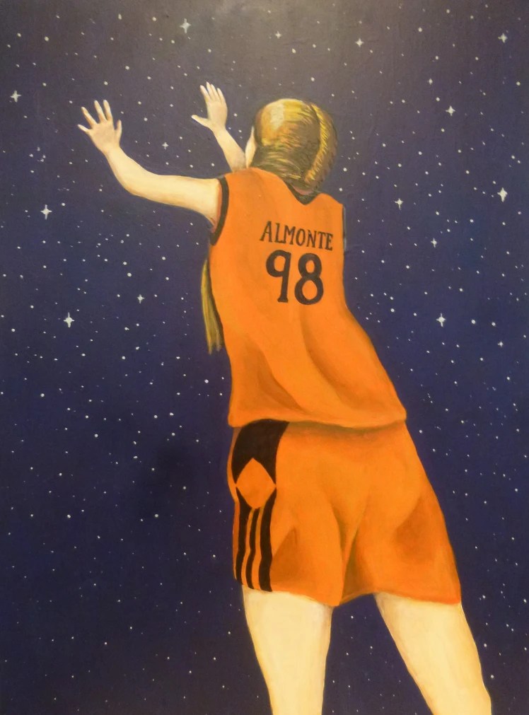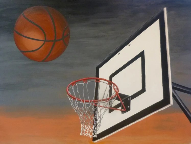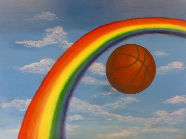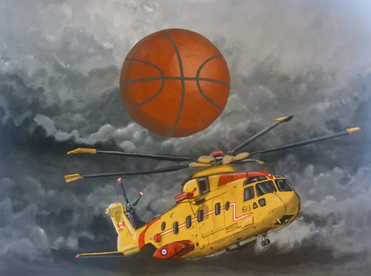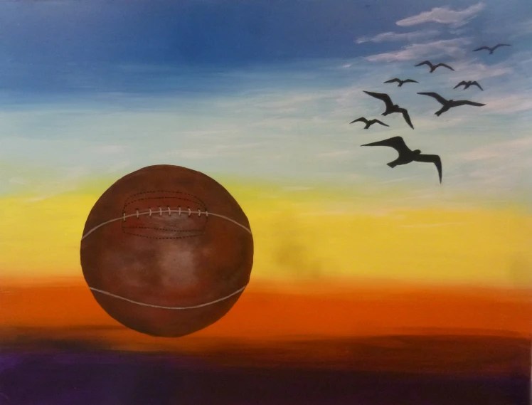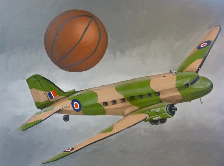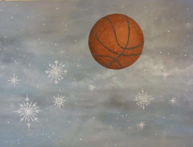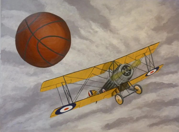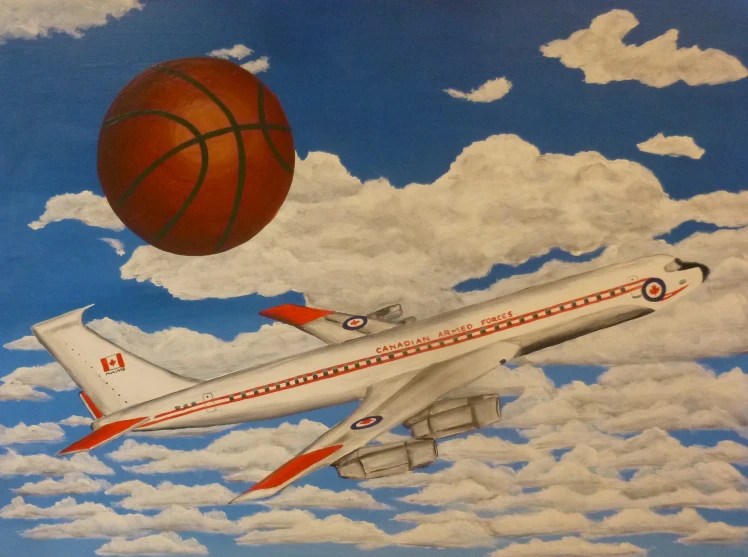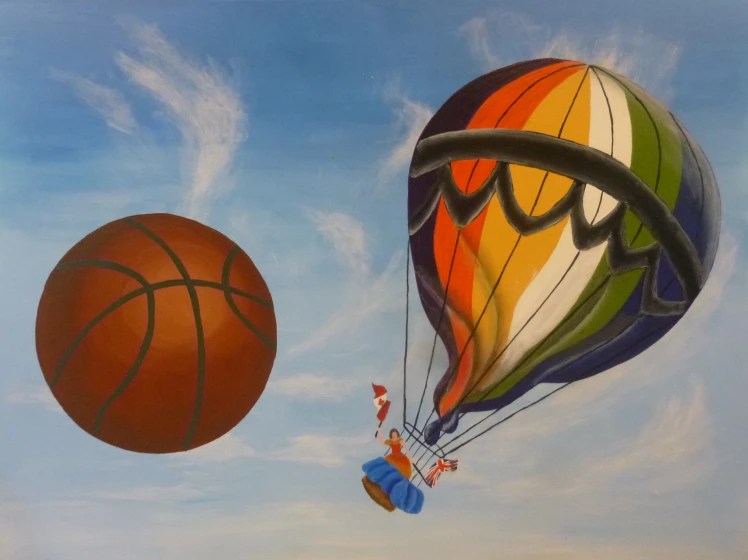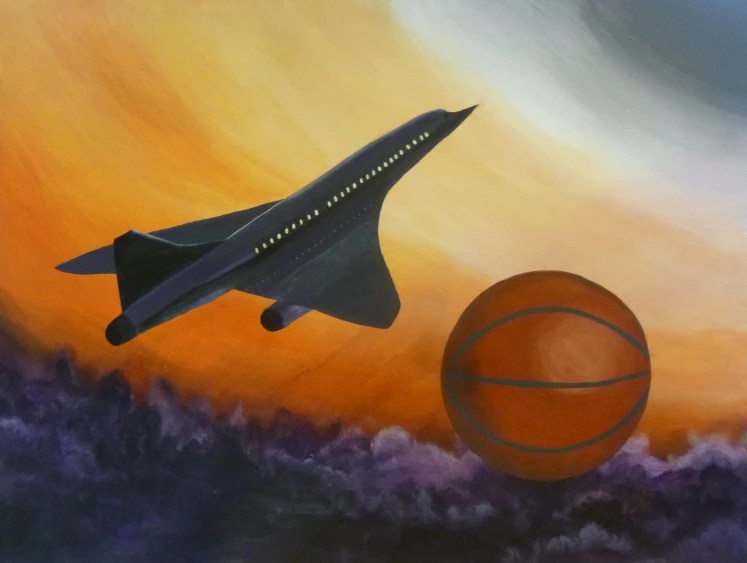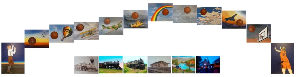 The upper portion consists of 12 painted panels and shows a basketball travelling across the sky from early dusk to midnight, passing eras of air transport and though various types of weather.