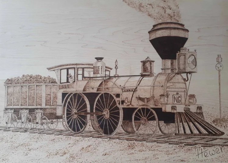 The bottom portion consists of 6 panels of various medium (pyrography, photography and painting) and depicts eras of train transport travelling through the seasons.